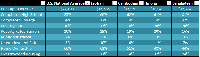 Perhaps, what should not be surprising after seeing the per-capita numbers, are the poverty rates. Hmong Americans, the worst off, have a shocking 26% poverty rate. Bangladeshi Americans come in at 20%, Cambodian Americans at 18%, and Pakistani Americans at 15%, Vietnamese and Thai Americans come in at 14%, and Laotian and Korean Americans at 13%. The national average is 10% living below the poverty line.