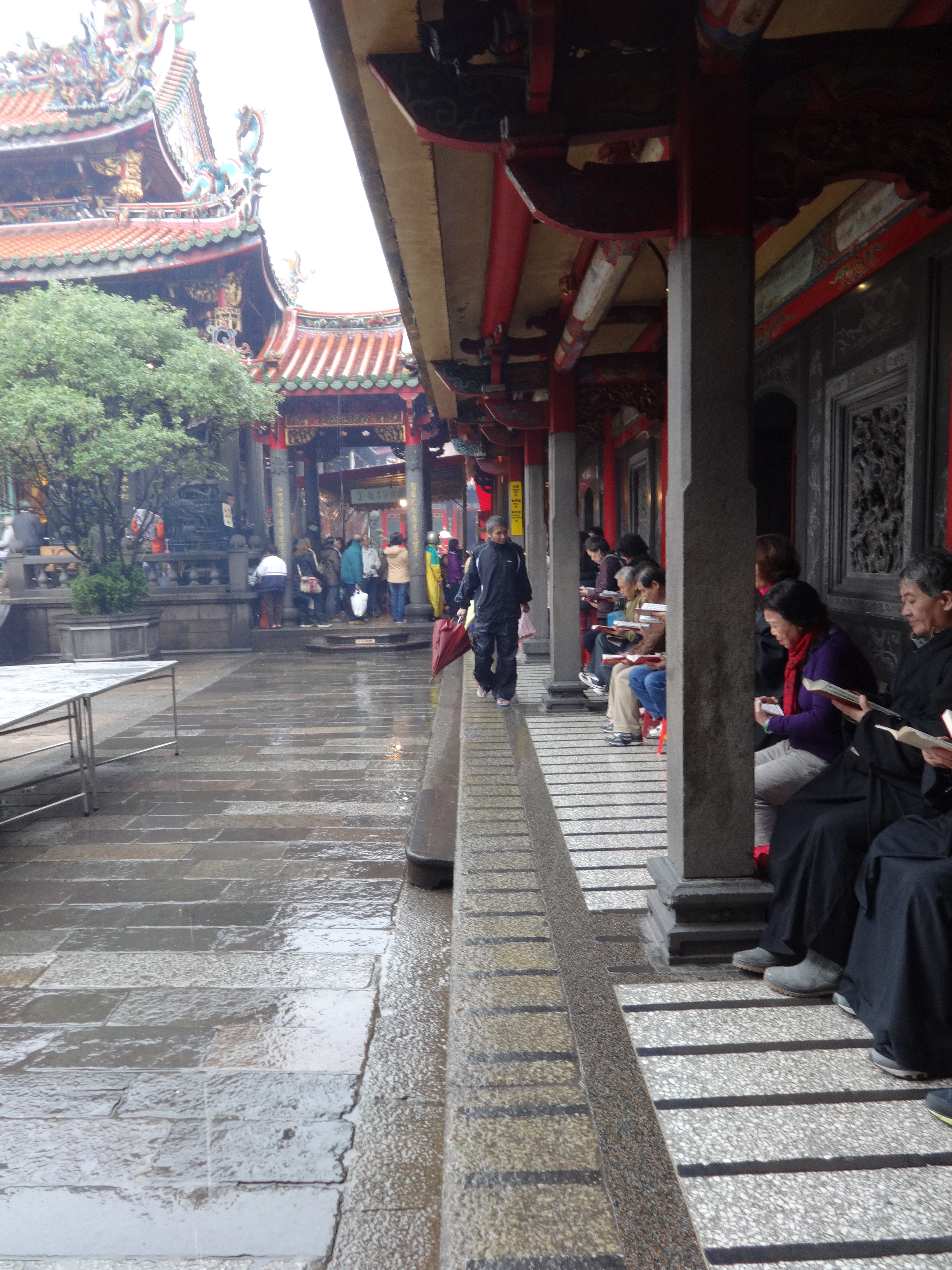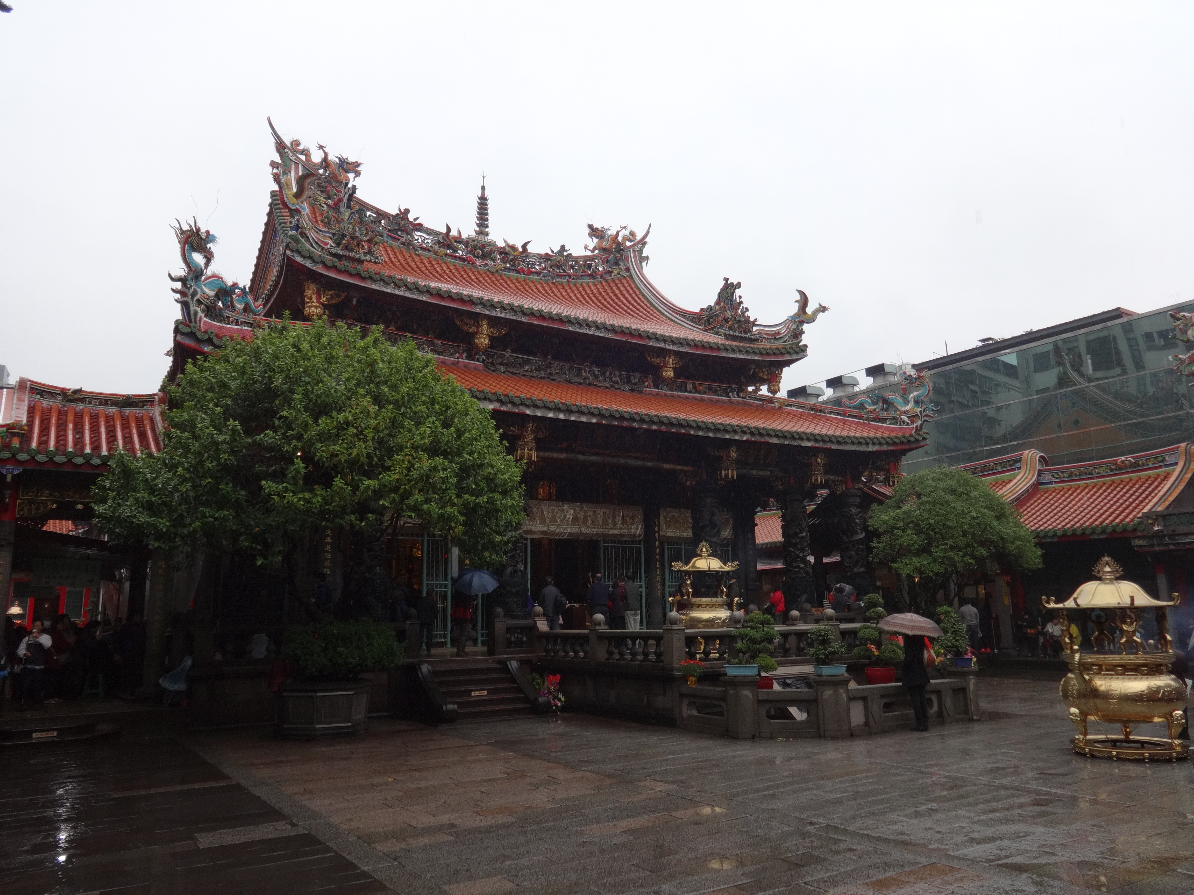 The Lungshan Temple located in Taipei, Taiwan, was built in 1738 by immigrants from the Fukien (Fujian) province of China who settled in Taiwan. It is primarily a Buddhist temple but has incorporated Daoist and Matzu tradition, a Goddess of marine voyage (helpful for island dwellers). This temple is regarded as a masterpiece of Taiwanese, Chinese, and Buddhist architecture. In 1945, the United States bombed the temple in our conflict with the Japanese, who had taken Taiwan as a colony from China for about fifty years, and much of the temple and many irreplaceable artifacts and works of art were destroyed. Nevertheless, the temple was rebuilt and designated a historic site, and really is a historic and beautiful must-see for anyone visiting Taipei.